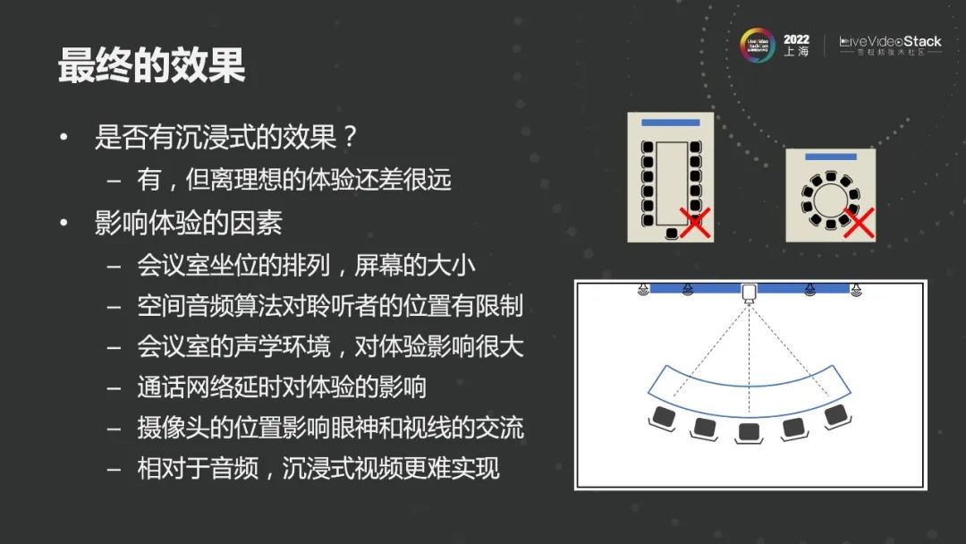 最终实现的效果是有沉浸式的效果,但离理想中接近于自然交互的体验还有较大的差距。这里有会议空间的限制,常见的会议的位置排列,如上图中长方形和圆形的会议排列,对远程音视频交互体验是不友好的,很难有沉浸式的感觉。会议室的布置应采取下图的方式,所有的人面对显示屏,这样有很好的视觉呈现感,并且通过空间音频算法实现声音的空间感。空间音频算法本身也有一定限制,采取VBAP算法整体来说会有黄金位置,离开黄金位也会有方位感,但越往两边体验越差。其他的影响比如通话延时,对体验影响非常大,短期内很难改善。另外,摄像头的位置会影响到眼神视线的交流,也会对整个沉浸式视频体验有非常大的限制。整体而言,我们还是在比较初期的研究阶段,也希望整个行业可以有多一些投入,一起把会议室沉浸式交互体验做得更好。