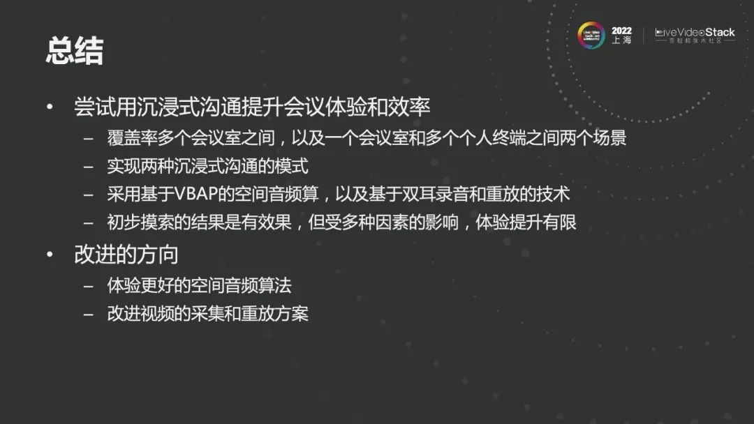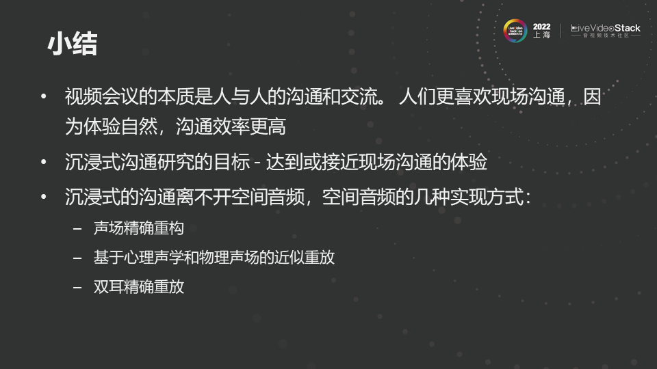 小结一下。视频会议本质是人与人沟通交流,人们更喜欢现场沟通,因为现场沟通更自然,沟通效率更高。我们希望通过沉浸式沟通技术使得远程沟通的体验接近现场沟通的体验,沉浸式沟通离不开空间音频上述三类实现方式。