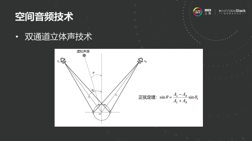 空间音频技术最常见是立体声技术,存在了很长时间。原理很简单,对一个声音通过改变两个喇叭上播放的馈给信号的大小,产生通路声压级差别,在人的双耳叠加,产生相延时差,利用人的心理声学效应产生虚拟声源。虚拟声源与喇叭角度之间满足正弦定理关系,从公式可以看出,模拟虚拟声源位置是在两个喇叭之间,一般情况下,在立体声可听范围是正负45度左右。