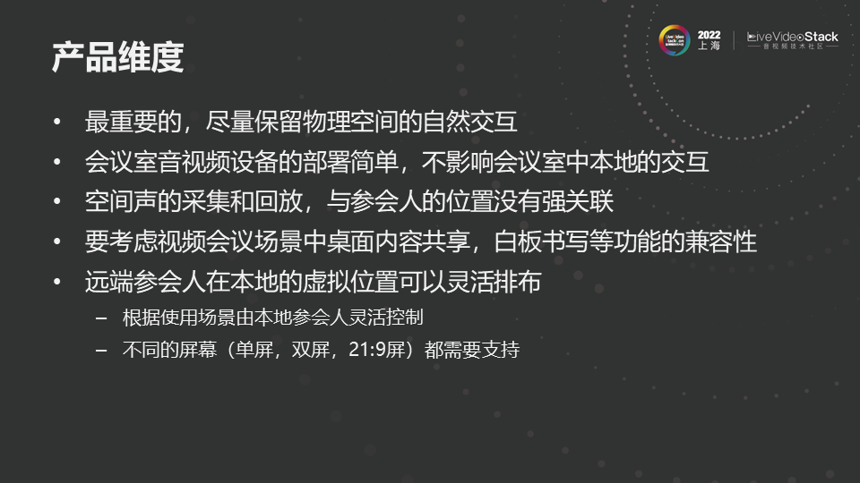 空间音频在实时通信中应用的挑战非常大,在娱乐领域,声音与图像大部分是事先处理好的。在游戏中内容的元素是事先生成的,所展示的空间位置可以根据游戏的交互而变化;而电影院中内容是完全是先制作好的。但视频会议中的音视频必须实时地采集、处理和重放,会有比较大的技术挑战。从音频前处理来说,单是回声消除算法,对于空间音频中多个麦克风对多个扬声器的情况实现的难度就非常高。还有沟通过程中的眼神交互也是非常难处理的。一般情况下因为摄像头并不在图像显示的位置上,因此当你看着远端人的图像,但远端的人并没有感觉你是在看着他的。因此实时交互中有很多挑战会影响沉浸式的体验。