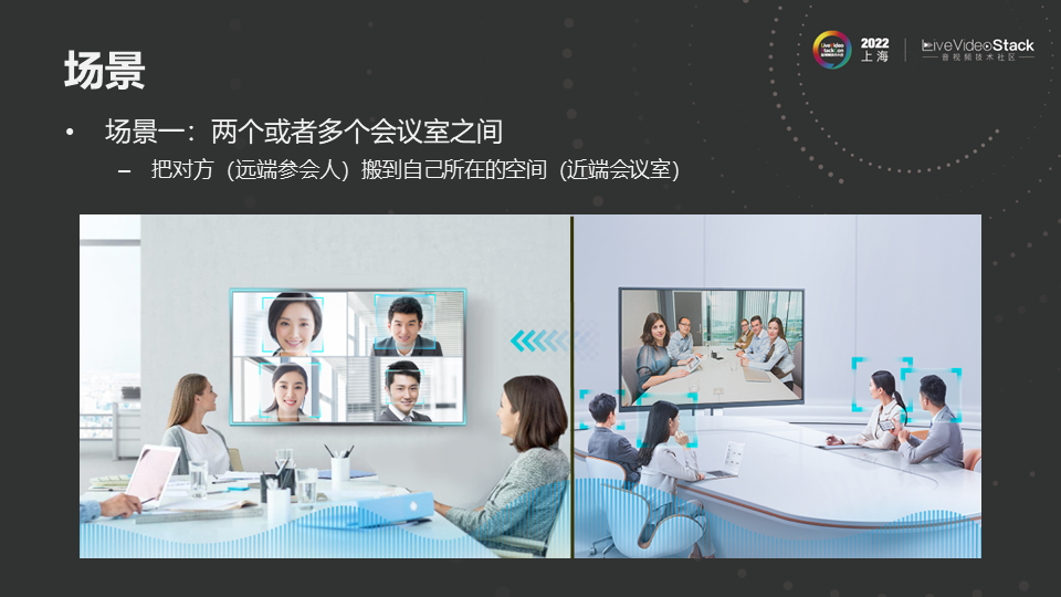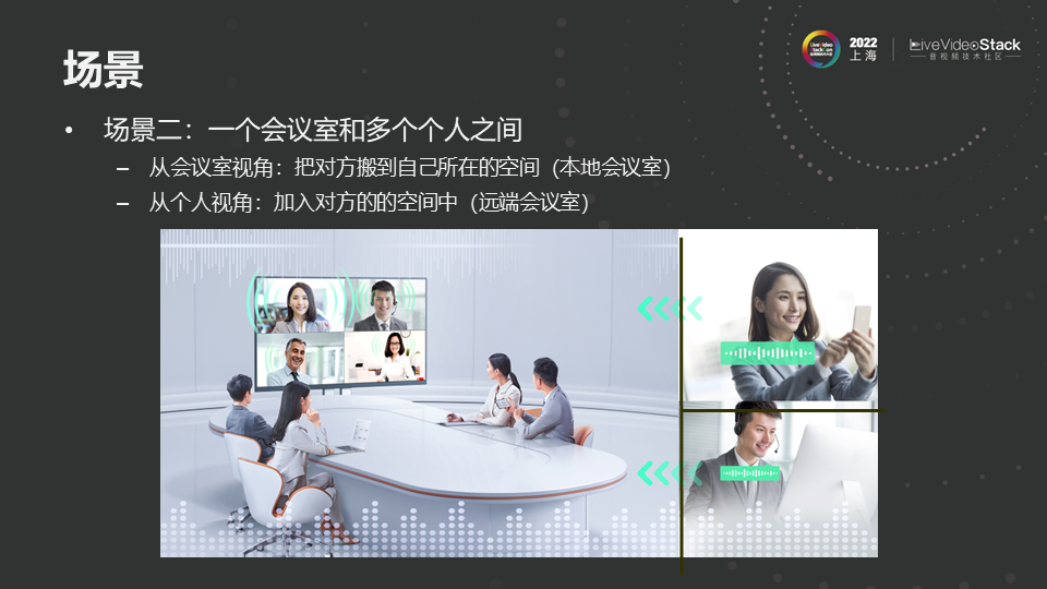 这里选了两个场景,第一个场景是两个或者多个会议室之间,在视频会议中最常见的场景之一,这里展示的是两个会议室。左边是本地会议室,右边是远端会议室,将远端会议室每个人的图像和声音在本地会议室呈现,在呈现过程中,做到左上角女孩说话,那么声音感觉从左上角发出而不是从电视下方发出。两个人在同时说话,能感知两个声音来自不同的方向。