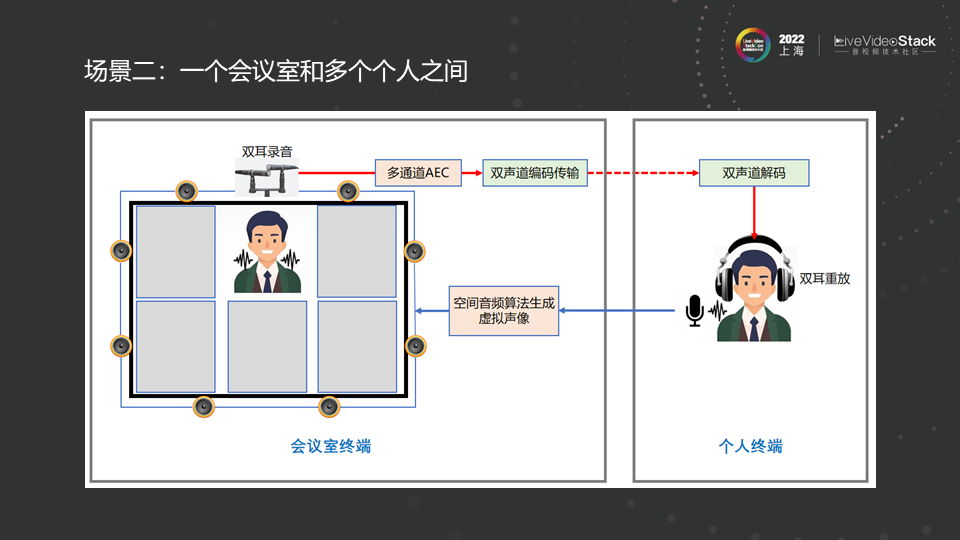 上图是第二个场景中具体的框架,从会议室到个人端通过双耳录音,多声道回声消除和降噪处理,双声道编码传输,到远端解码,双耳重放,就能在远端感受到会议室的空间效果。从个人终端到会议室,是通过在个人终端上采集图像声音,在本地会议室展现,通过围绕在显示器周围的喇叭和空间音频算法产生虚拟声像,保证声像和图像的一致性,能够给本地会议室用户带来沉浸式的体验。