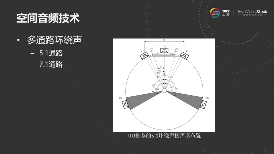 但多声道环绕声也有缺点,主要有两个方面:第一,对于多通道而言声音采集、声源制作、到声音重放都是按照固定的位置进行的。上图是ITU推荐的5.1声道的布置方式,声音的采集或者声源制作必须依照此图规定的位置。如果因为物理空间限制,喇叭如果不能按照规定的角度布置,听到的声音无法精确还原音源制作时的方位,还有可能出现错乱;第二,对于多声道环绕立体声技术,声音方向变化在侧后方的感知不连续,假设一架直升机绕着你以均匀的角速度飞,理想情况下,在此环境中你听到声源的移动应该是均匀的,但实际上在侧方后方会感知到声音方位的变化是不连续的,有跳跃感,从一个喇叭跳到另一个喇叭。