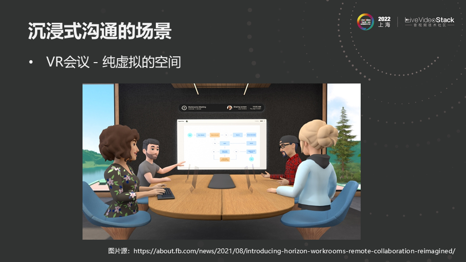 第三个场景是纯VR场景,所有人都在一个虚拟空间中,上图来自Facebook,完全基于元宇宙的开会场景,所有的人看到的东西,听到的东西,包括PPT的展示都是在虚拟空间中进行的。