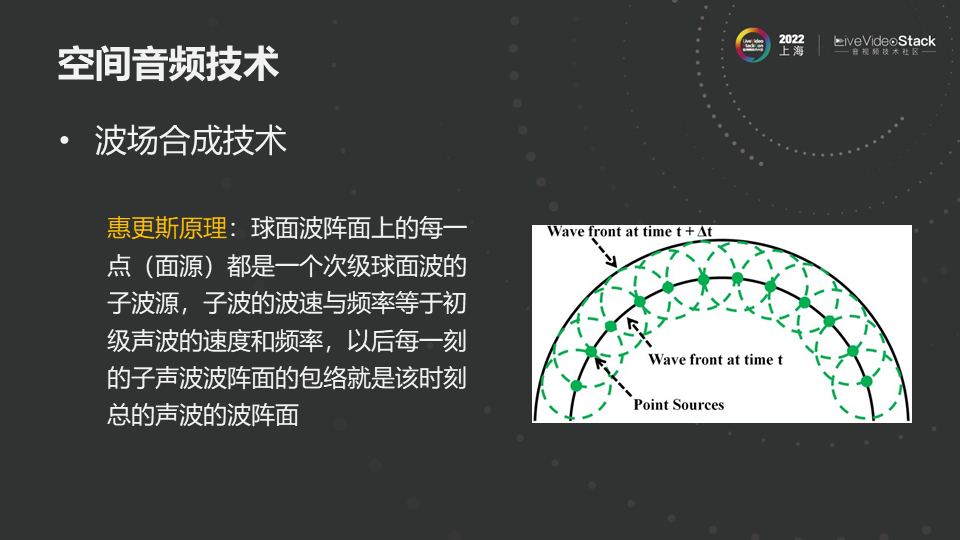 最后再简单提一下波场合成技术,其基础原理是波阵面中的每个点是下一个波阵面的次级声源。当我在说话,我的声音在空间中传播,如果我前方麦克风阵列将每个点的波场信息采集,在另外一个地方通过对应的扬声器回放,可以恢复出整个声场信息。这个方法实践起来会涉及到大数目麦克风阵列和喇叭阵列,比较难实现。
