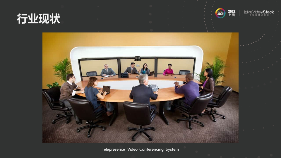 这是一个目前行业中比较普遍的远真(Telepresence)会议系统。这类系统一般是部署在两个会议室之间,但是要注意的是:第一,表面上这个系统连接了两个会议室,但这个的本质是“把对方搬到自己所在的物理空间”,并不是两个物理空间的连接和扩展。第二,这一类的系统一般采取固定的摄像头视角,固定的麦克风采集位置,和参会人的坐位是强绑定的关系。第三,这类的系统里面并没有应用空间音频的算法,因为麦克采集和喇叭播放的位置是固定的,每一个屏幕下发都有一个扬声器,这样声像位置是固定的物理声像位置。
