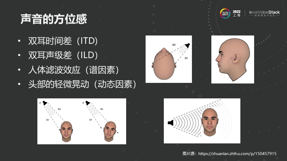 空间音频的基本要素是方位感和空间感。方位感的产生有以下四个因素。一是双耳时间差,比较容易理解,声音从侧面传过来,离右耳近,左耳远,产生时间差,会被大脑解释不同的方向。二是双耳声级差,头部遮挡会带来声压级差异。三是人体的滤波效应(谱因素),两个耳朵的时间差只能定位水平方向,但声音在耳廓、肩部等位置反射可以帮助人定位来自于上下和前后方向的声音。四是头部的轻微晃动也可以帮助定位。人对声音方位的感知除了正下方之外几乎可以做到三维空间360度的感知。