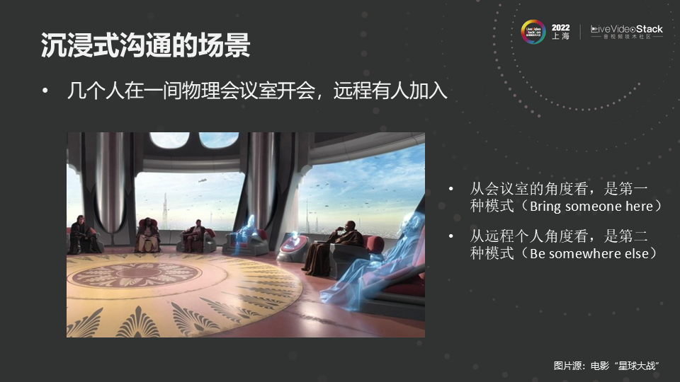 第一个场景是有几个人在线下开会,远程有人加入。上图是星球大战中的一个场景,这里能看到有几个全息影像,这是典型的线下会议与线上会议互通场景,从本地会议看,是将远端的人拉到本地会议室,交互的空间是本地会议室;从远端参会人角度看,是加入到对方空间中,感知到的是对方会议室的空间感。
