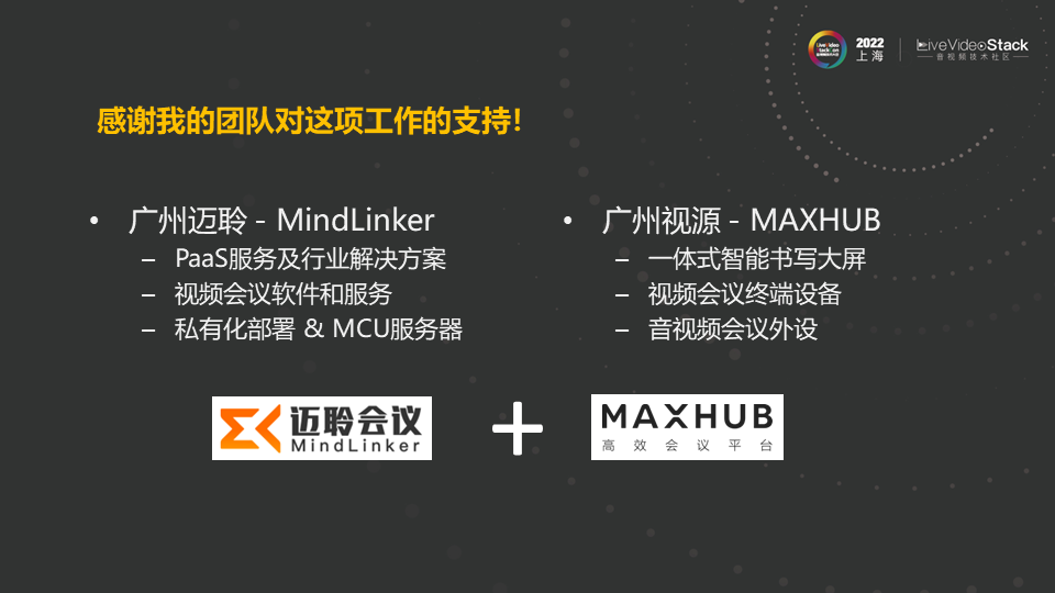 最后感谢广州迈聆和MAXHUB团队对这项研究工作的支持。广州迈聆主打产品是视频会议软件和服务,也提供PaaS服务及行业解决方案。MAXHUB是广州视源旗下的一个品牌,主打一体式智能书写大屏以及音视频终端、外设等,是行业的领导者。目前广州迈聆与MAXHUB合作打造了一整套高质量的视频会议解决方案。此项工作就是基于这套视频会议解决方案开展的。