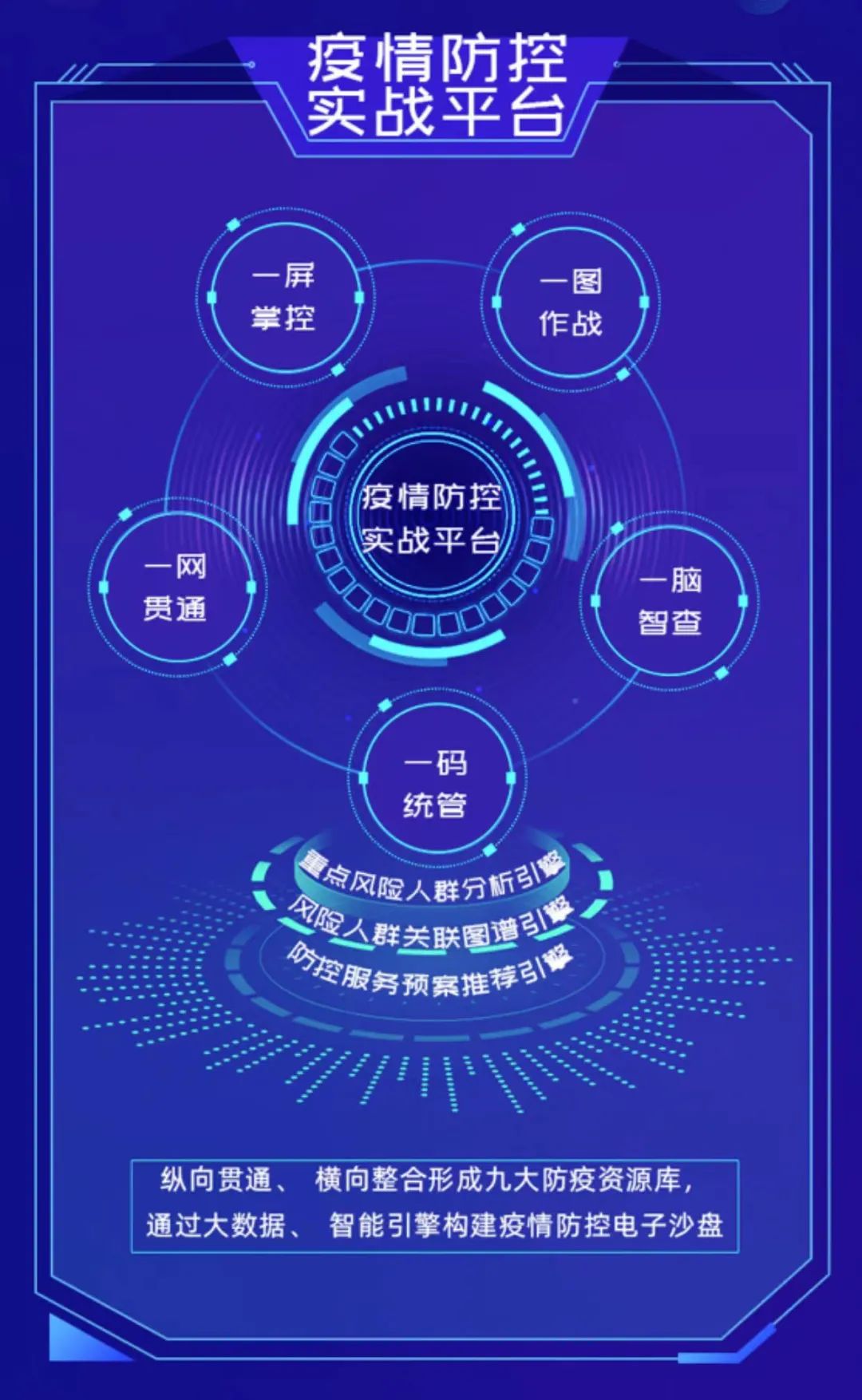 底层架构是一个大数据平台和9大防疫资源库,汇聚了卫健、公安、交通、通管、民政等多个部门的数据,通过对这些数据的采集、治理、聚类、整合、分析,可以针对重点人群构建一份准确的个人防控档案。