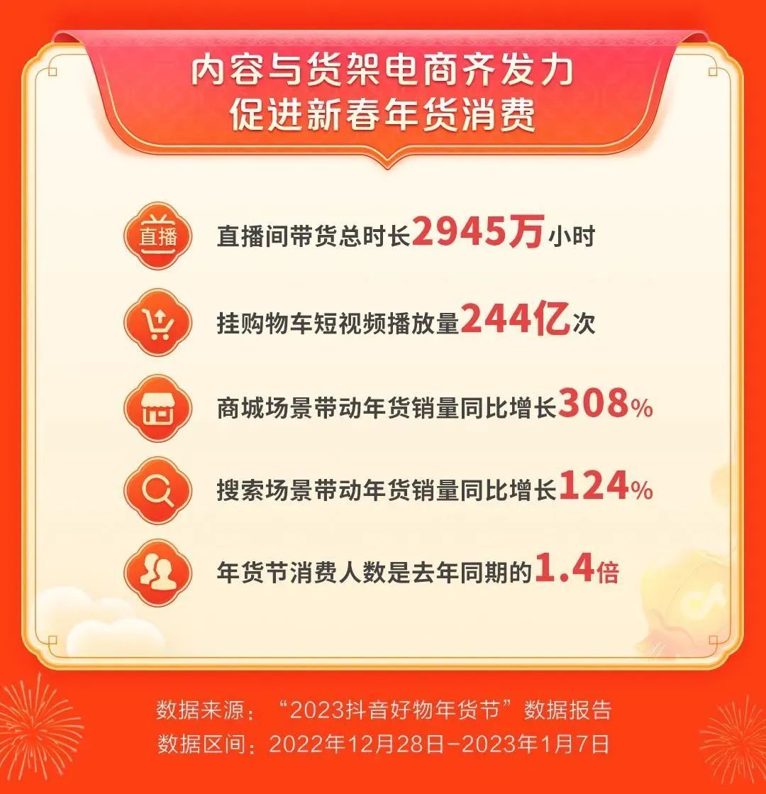 1月10日,抖音电商发布了“2023抖音好物年货节”数据报告报告显示,“抖音好物年货节”期间,平台商城场景带动年货销量同比增长高达308%,搜索场景也带动销量同比增长了124%。