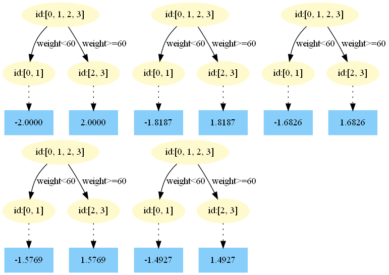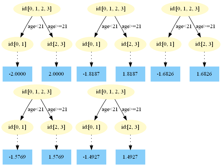 feas_logit = {'age': -1}GBDT是cart二叉决策树集成实现的,对于每一棵cart树,我们会遍历所有特征,尝试以每一特征值作为决策的分裂点。我们可以在这里加入约束限制,如年龄age特征,我们认为它和标签值是负相关的,那么对于每次分类age<特征阈值的左边分支的样本群体的标签均值应该大于右边分支的(反之亦然)。如果树生长的特征分裂不符合业务逻辑的,则会略过,继续其他特征值的搜索。