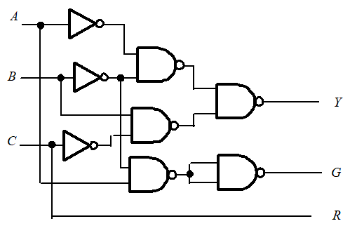电热水器内部容器示意图中,A、B、C为三个水位检测元件。当水面低于检测元件时,检测元件输出高电平;水面高于检测元件时,检测元件输出低电平。试用与非门设计一个热水器水位状态显示电路,要求当水面在A、B之间的正常状态时,绿灯G亮;水面在B、C间或A以上的异常状态时,黄灯Y亮;水面在C以下的危险状态时,红灯R亮。