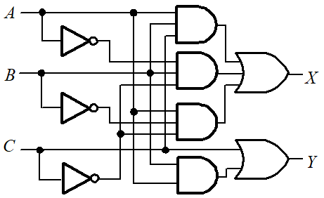 设输入变量A、B、C为1表示雷达起动,为0雷达关闭。输出变量X、Y为1,表示发电机起动;为0,表示发电机停止。