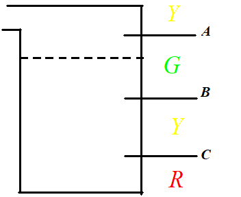 1.当水面在A、B之间的正常状态时,绿灯G亮; 2.水面在B、C间或A以上的异常状态时,黄灯Y亮; 3.水面在C以下的危险状态时,红灯R亮。