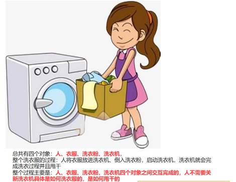 C++是面向对象的语言,关注的是对象,把洗衣服这件事拆分成人,衣服,洗衣机等对象,抓住对象之间的关系,最后通过对象交互来完成。