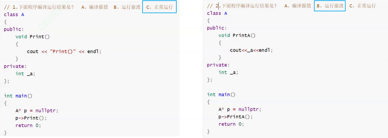 答案是代码1正常运行,代码2运行崩溃 或许有人说:这个p是空,p->这里不是就是错的吗?之前我们在第7点已经给大家讲过,成员函数不是存放在对象中,而是存放在了公共代码段中,不是你的,肯定不在你那里找喽,p->Print()只是传递了p的地址.同时在成员函数内部的this接收到的都是nullptr,所以代码2在打印_a的时候实际是this-> _a,也就是*nullptr-> _a,就出现了对空指针解引用的问题,所以运行崩溃了,而代码1只是打印的一个常量字符串,所以能正常运行.