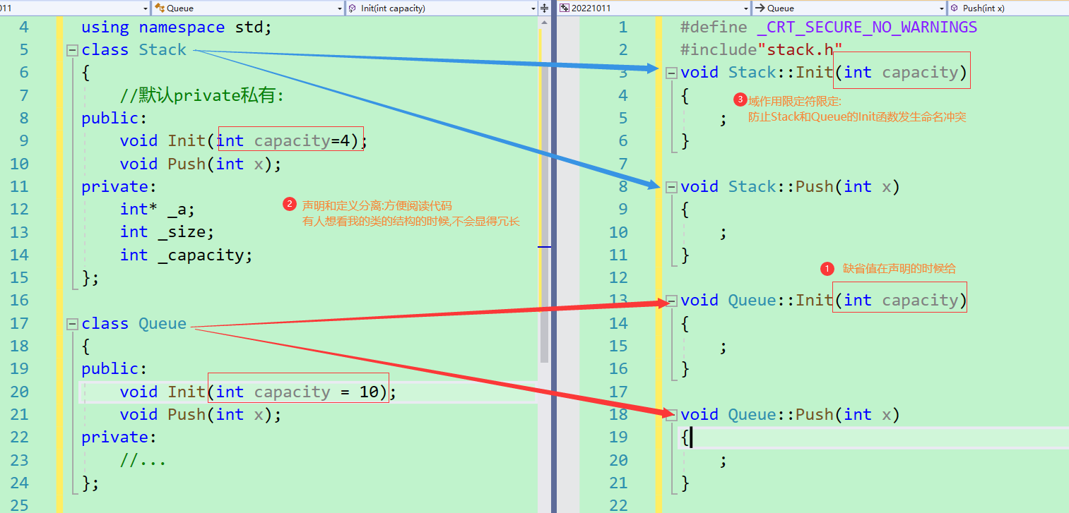 }那么对于这个class类,我们如果要实现声明和定义分离,我们该怎么做呐?
