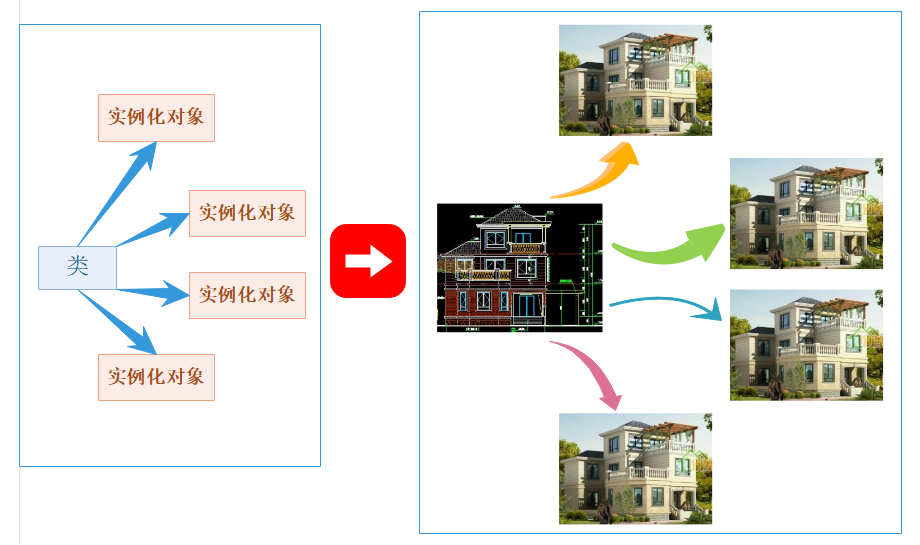 如果把类定义为图纸,那么类的实例化就是拿着图纸建造房子,对象就是我们建造出来的房子.