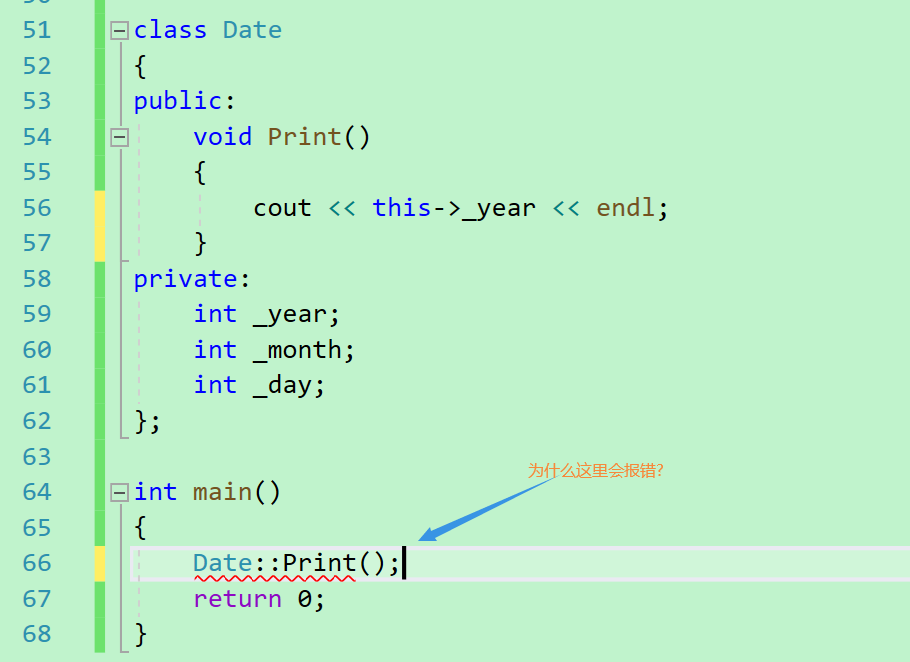 实际上,这里的成员函数的确是定义好了的,但是呐,这里就是因为没有哪一个对象来调用Print()函数,所以也就没有办法传隐式的参数,从而出现了这个语法问题.