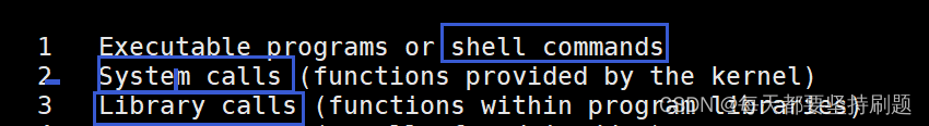 作用:man是一个查看命令,是一个查看系统调用和C接口的手册,man手册是有编号的