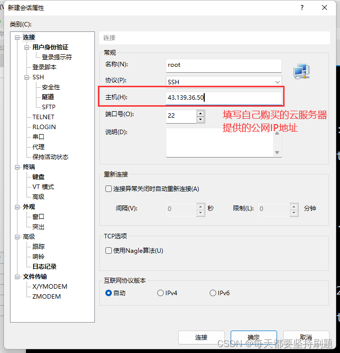 (2)填写公网IP下的root用户名