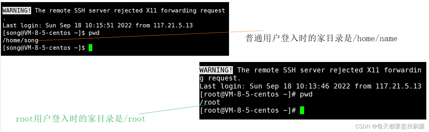 普通用户和root用户: 根目录: / 家目录;
