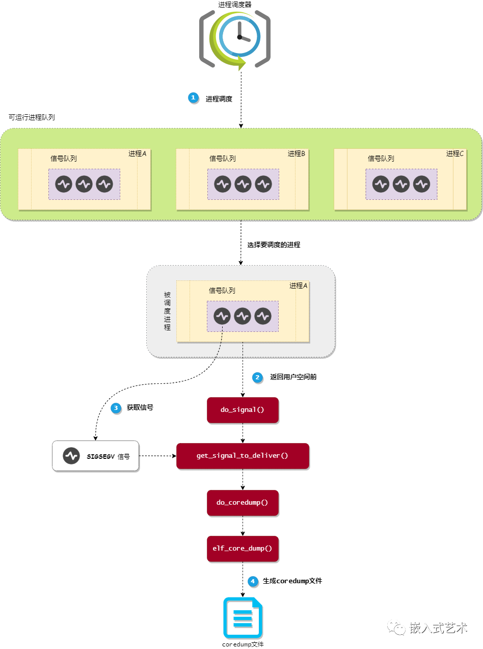 从系统调用返回、从硬中断处理程序返回和从进程调度程序返回等。上图主要通过从进程调度程序返回作为示例,来展示内核是怎么生成coredump文件的。