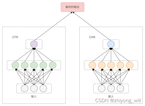 多模型的融合是指根据不同的任务单独训练不同的模型,最终根据最终的目标将各模型的结果相加或者相乘后进行融合排序。以CTR和CVR为例,最终的目标通常是CTCVR,因此,可以分别训练一个CTR模型和CVR模型,如下图所示: