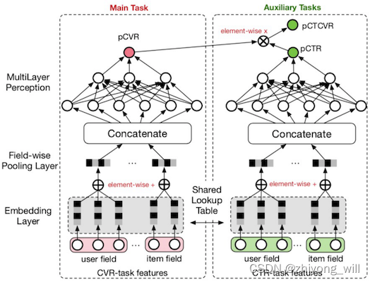 其中,\theta _{cvr} 表示的是CVR塔中的参数,\theta _{ctr} 表示的是CTR塔中的参数,y_i 表示的是样本\mathbf{x}_i 在CTR任务上的label,z_i 表示的是样本\mathbf{x}_i 在CVR任务上的label,f\left ( \mathbf{x}_i;\theta _{ctr} \right ) 表示的样本\mathbf{x}_i 在CTR塔中的结果,f\left ( \mathbf{x}_i;\theta _{cvr} \right ) 表示的是样本\mathbf{x}_i 在CVR塔中的结果。