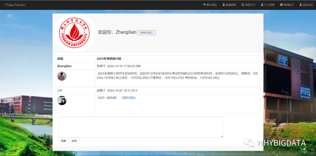 在studyReply.jsp页面,主帖下的每一条回帖都设置有“删除回帖”按钮,页面设计和逻辑实现和普通帖子的删除回帖也是大同小异的。