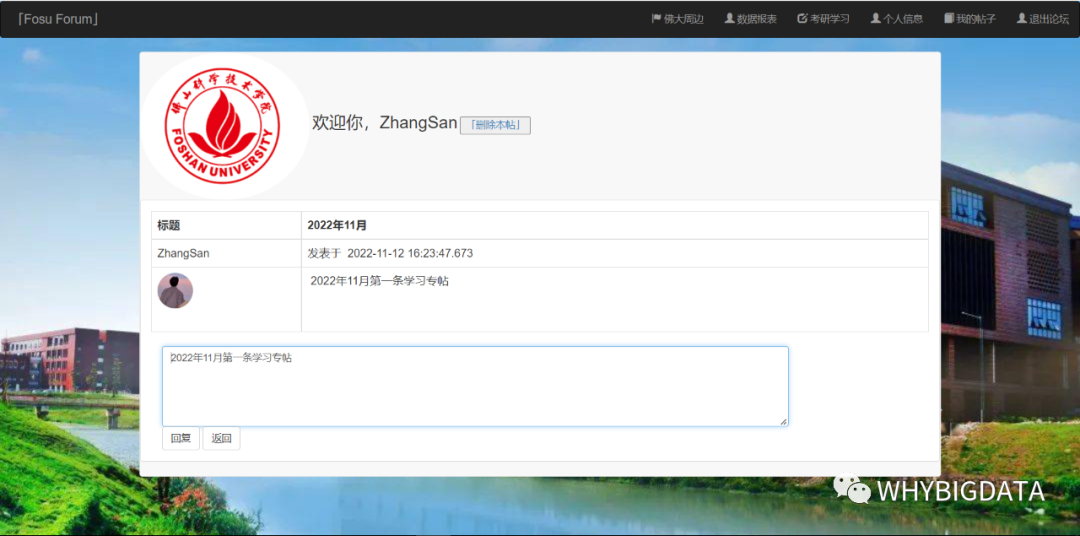 通过studyReply.jsp页面的“删除本帖”按钮,页面设计和逻辑实现和普通帖子的删除也是大同小异的。