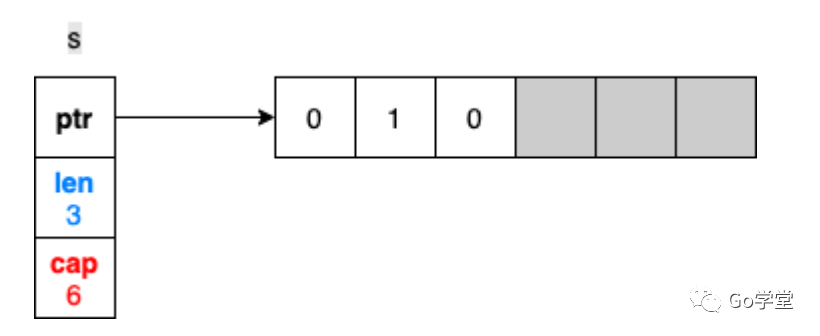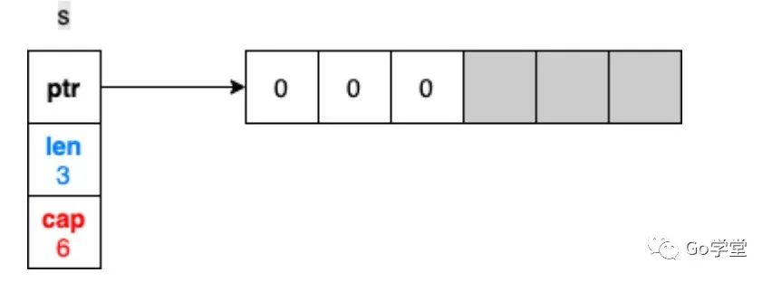 该切片创建了一个能够容纳6个元素(容量)的数组。同时,因为长度length被设置成了3,所以,Go仅仅初始化前3个元素。因为slice的元素是[]int类型,所以前3个元素用int的零值0来初始化。剩余的元素空间只被分配,但没有使用。