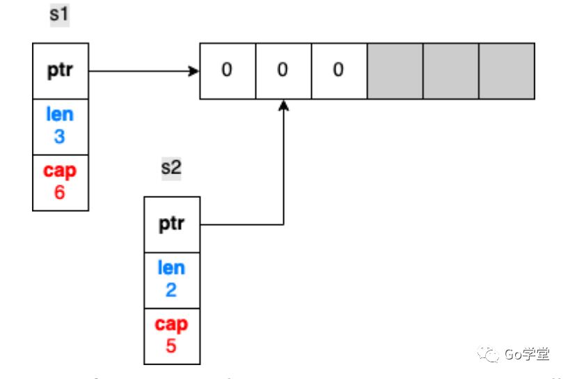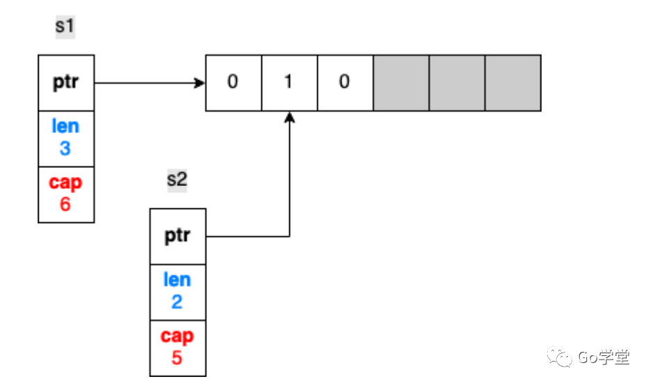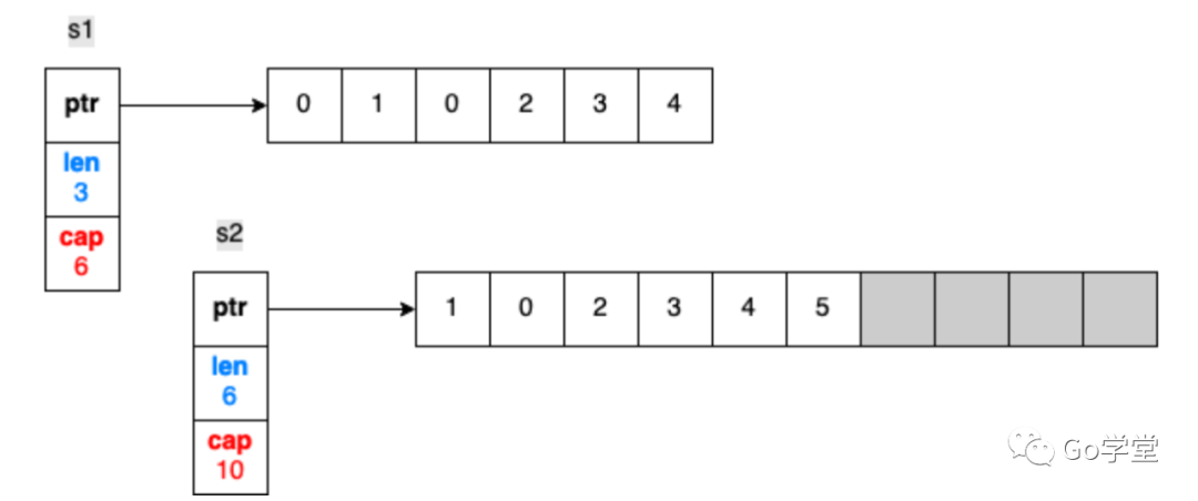 注意,这时s1和s2分别指向了两个不同的数组。实际上,s1依然是一个长度为3,容量为6的切片,同时也有一些可用的buffer空间,因此,它依然是引用了最初的那个数组。同时,新创建的数组,会从s2的起始位置将数据拷贝到自己的空间上来。这也就是为什么新数组的第一个元素是1,而不是0的原因。