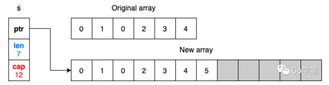 [0 1 0 2 3 4 5]因为数组是一个固定长度的结构,只能将元素4给存储进去。当我们想插入元素5时,该数组就已经满了,Go会创建另一个数组,并且空间大小是原来容量的2倍,然后将原数组中的所有元素都拷贝到新数组中去,再在新数组中插入元素5,如下图所示: