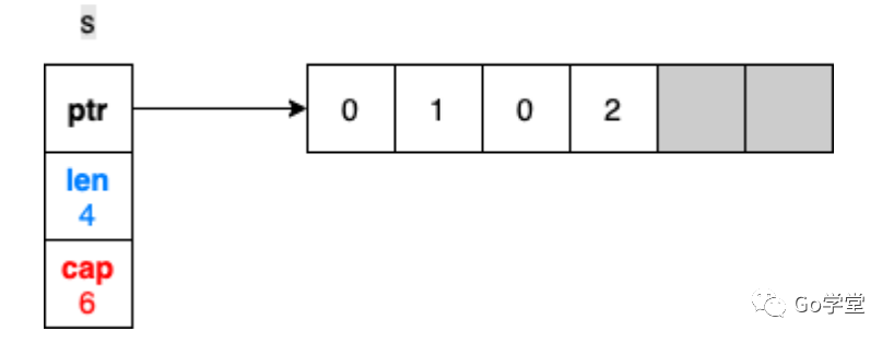 但是,不允许访问切片长度(length)以外的元素,即使长度以外的内存空间也已经被分配了。例如,s[4] = 0 会引发panic: