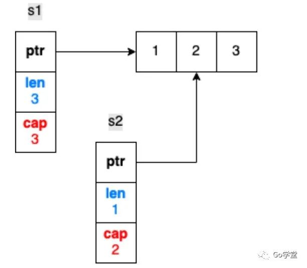 s1是长度为3,容量为3的切片结构,而s2是长度为1,容量为2的切片结构,s1和s2的都指向相同的底层数组。
