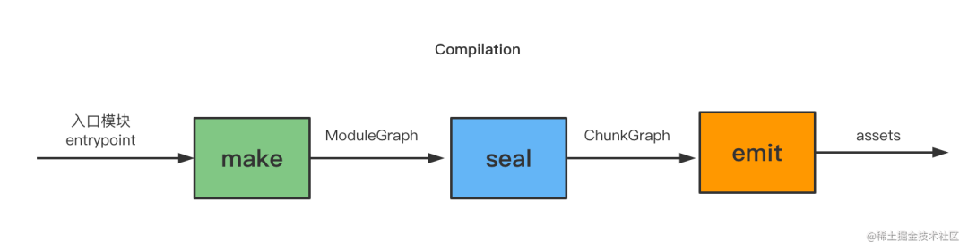 webpack 的处理单位是模块,它的编译流程分为 make、seal、emit: