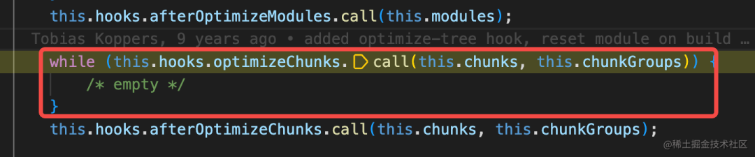 首先在 compiler 的 thisCompilation 的 hook 里来注册 compilation 的 optimizeChunks 的 hook。