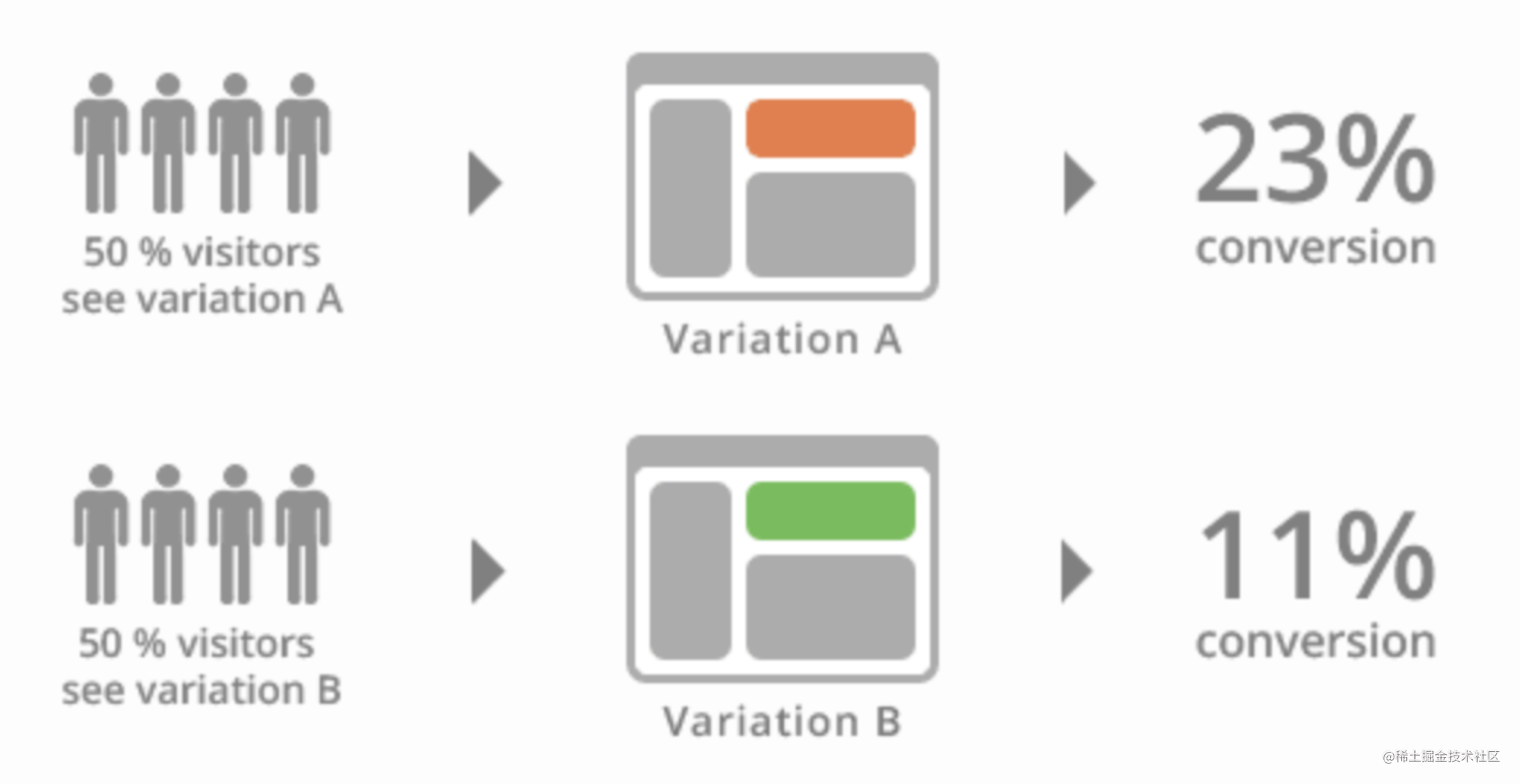 要点是,AB的两种功能都是可用的, 投放的用户群体无差别,让用户选择更受欢迎的功能,后期可能是A上线,也可能是B上线。