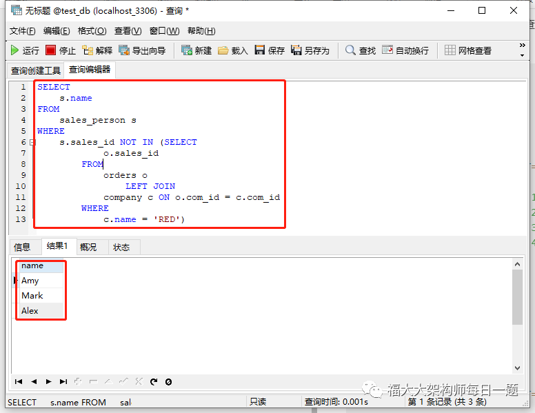 2023-01-15:销售员。编写一个SQL查询,报告没有任何与名为 “RED” 的公司相关的订单的所有销售人员的姓名。以 任意顺序 返回结果表。