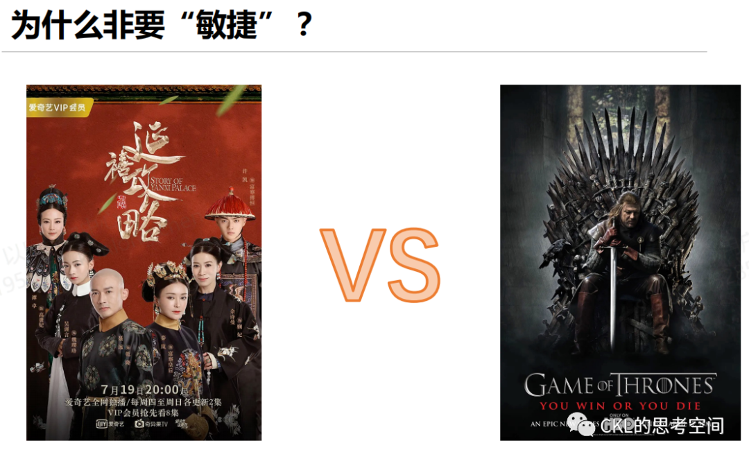 《Game Of Thrones》,按季播放的美剧,它的特点是把一个大IP切成小任务,边写边拍边播,观众看到剧的等待时间变短了(交付时间变短)。而且,它还可以根据用户的反馈不断的修改剧情,琼恩·雪诺明明已经死了,但是用户不买账,在后期又复活了。这就是敏捷的特点,小批量快速交付,及时收集用户反馈。在更短的周期内价值最大化,同时,也提升了应对变化的能力。