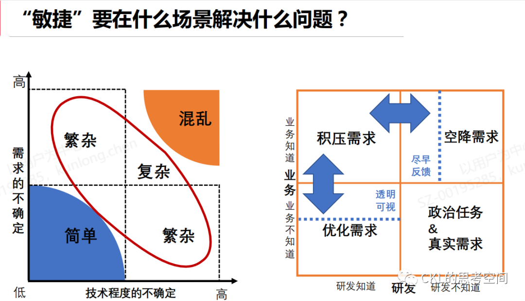 如上,左边是根据Cynefin框架演化而来的,可以用敏捷来解决问题的场景。从需求和技术的不确定性来划分。