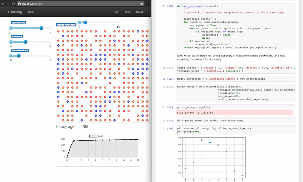 Mesa is an Apache2 licensed agent-based modeling (or ABM) framework in Python. Mesa allows users to quickly create agent-based models using built-in core components (such as spatial grids and agent schedulers) or customized implementations; visualize them using a browser-based interface; and analyze their results using Python’s data analysis tools. Its goal is to be the Python 3-based counterpart to NetLogo, Repast, or MASON.