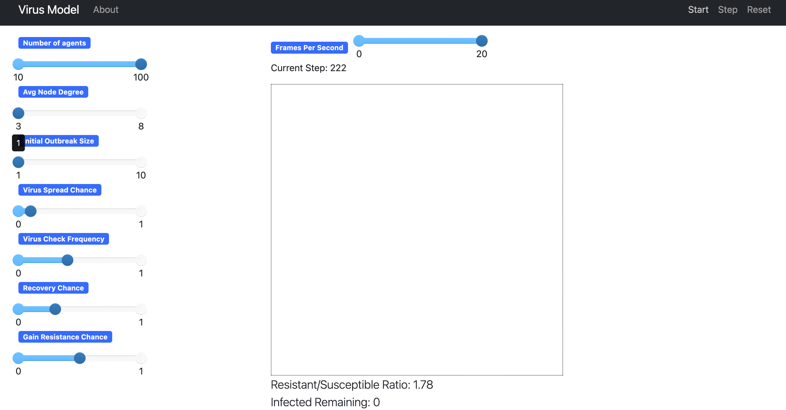 该模型演示了病毒通过网络传播。 虽然这个模型有些抽象,但一种解释是每个节点代表一台计算机,我们正在模拟计算机病毒(或蠕虫)通过这个网络的进程。 每个节点可能处于三种状态之一:易感、感染或抗性。 在学术文献中,这种模型有时被称为流行病的 SIR 模型。