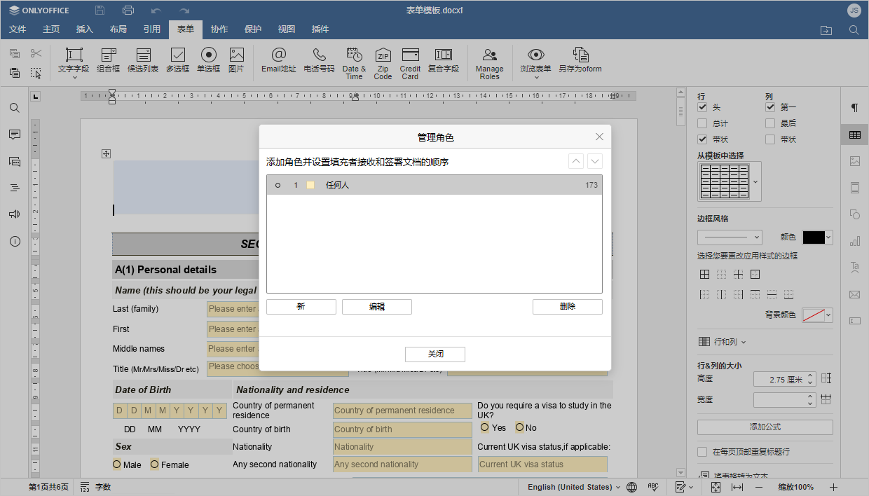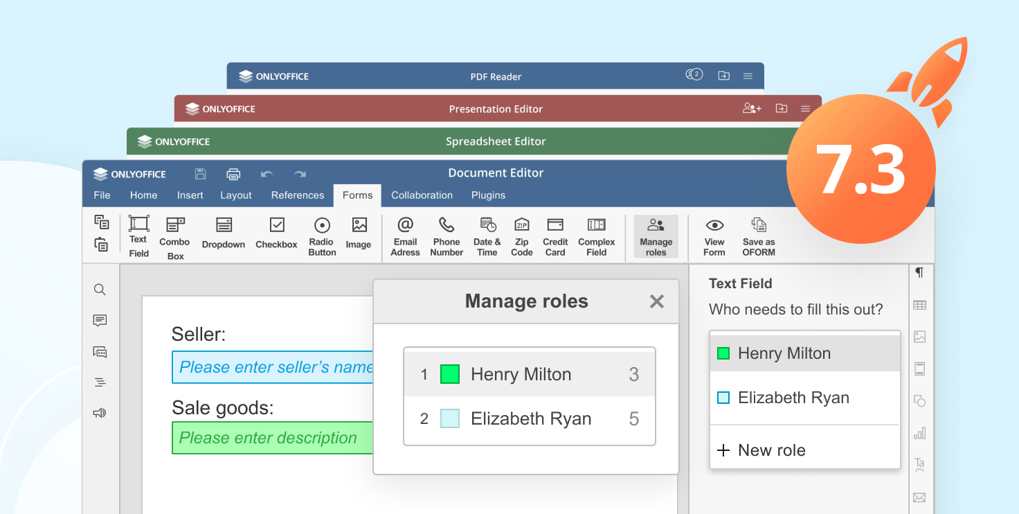 与 ONLYOFFICE文档 v7.3 一样,借助桌面编辑器最新版您也可为需要填写表单的用户分配各种角色,简化文档工作流。这样,用户就能根据角色匹配的颜色,直观地识别他们应该填写哪些字段。