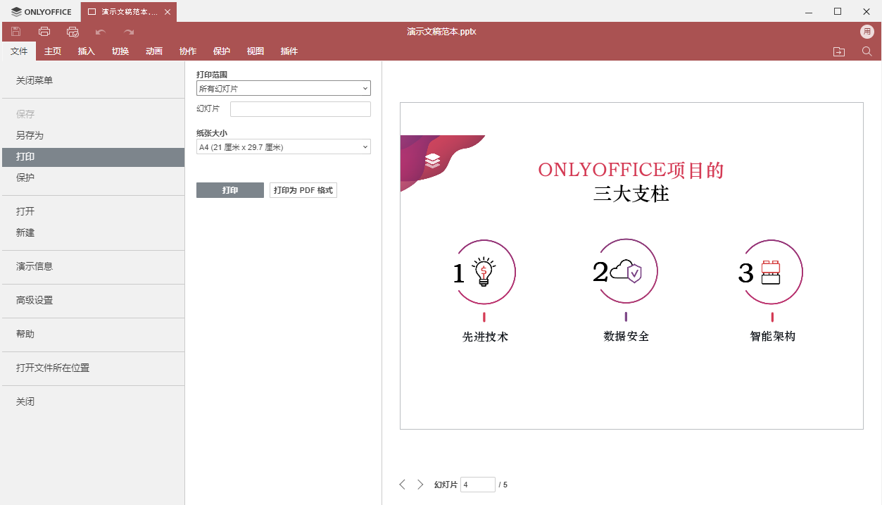 ONLYOFFICE 演示文稿也提供了一些新的功能。现在您可以使用特殊粘贴热键插入幻灯片。例如,在您的演示文稿中插入幻灯片时,您可以使用目标主题,保留源格式或将其作为图片插入。