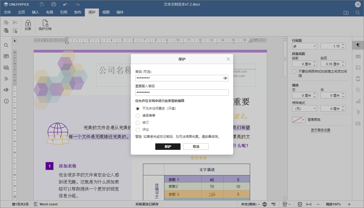 ONLYOFFICE桌面编辑器的更新版本提供了文本文档中的密码保护新选项。现在,您可以允许其他用户执行某些操作:他们可以打开文件阅读,填写字段,留下评论或在跟踪修改的模式下进行编辑。