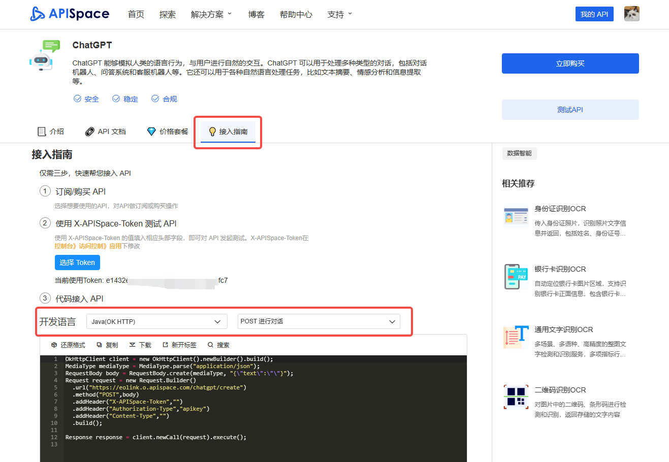 测试好之后,需要在代码里接入 API,APISpace 平台提供了多种语言的调用示例,可以帮助快速接入到代码: