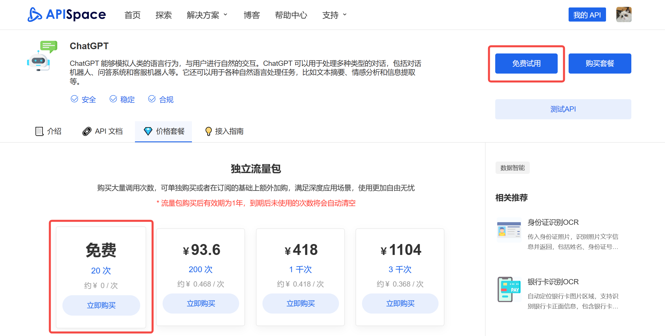 注册登录之后,在 API 详情页的右上角中可以看到【免费试用】的按钮,点击即可获得相应的免费次数